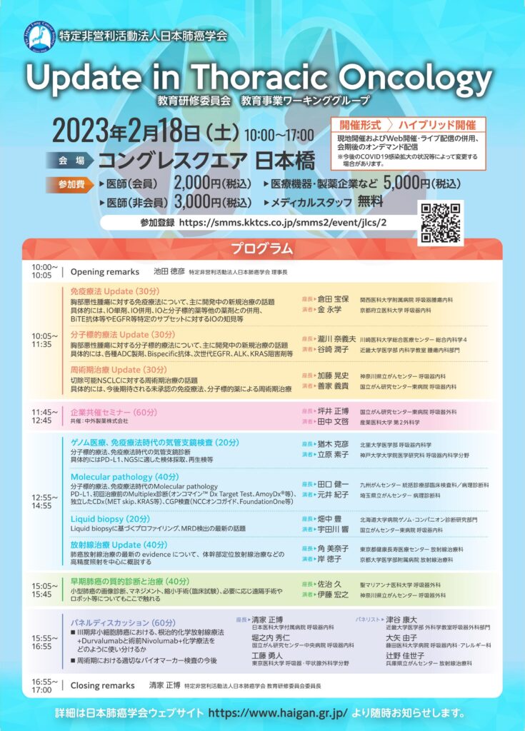 明日土曜は、日本肺癌学会の教育研修会事業として第2回Update in Thoracic Oncologyが、東京現地とWEBでhybrid開催されます。私は10時過ぎに座長ですので、早朝出発となります。とても良い内容なので、時間があいましたらご聴講ください。