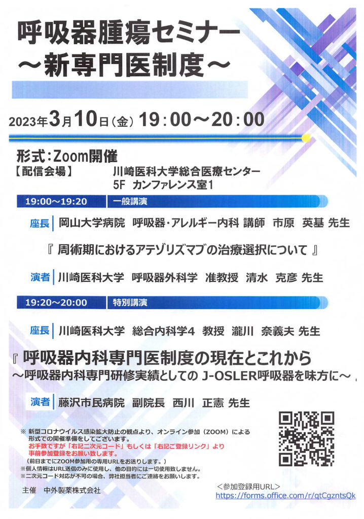 3/10(金)は呼吸器専門医制度に関して日本で最も造詣が深い(と、少なくとも私は思っている)西川正憲先生が特別講演の演者で、J-OSLER対策を含めたお話しを詳細に聞くことができます。一般講演も川崎医科大学呼吸器外科の清水克彦先生が周術期治療について面白いお話ししてくれます。奮ってご参加ください。