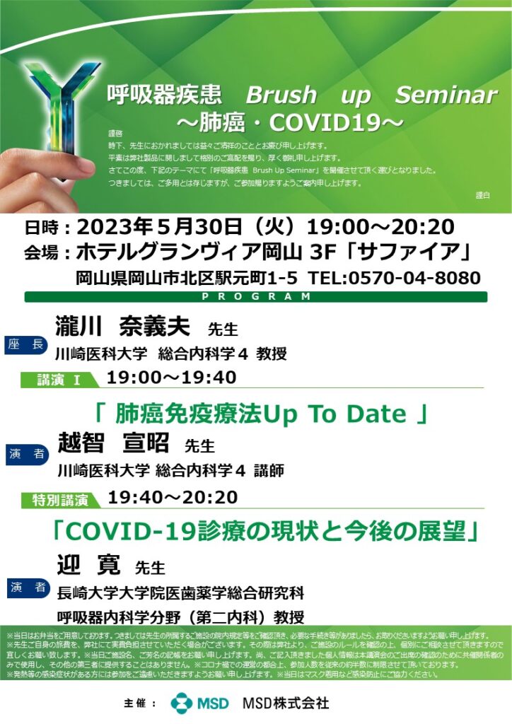 昨日は呼吸器疾患Brush up seminarとして、越智先生に「肺癌免疫療法up to date」を、長﨑大学の迎寛教授に「COVID-19診療の現状と今後の展望」を講演していただきました。長崎大学第二内科出身は川崎医科大学にもたくさんおられ、当院の白井先生、附属病院の岡先生、加藤先生、大石先生、吉岡先生の他、基礎講座の栗林先生と山内先生も長崎大学医学部出身とのことでした。迎先生は、COVID-19の他、インフルエンザ、混合感染、呼吸器感染遺伝子パネル、ワクチン、新しい肺炎ガイドラインなど、盛りだくさんのお話しでしたが、とても分かりやすかったです。現地とWEB開催であり、新潟大学、神奈川県立循環器呼吸器センター、宮崎大学など遠方からの視聴も多く、さすが全国区の迎先生でした。どうもありがとうございました。
