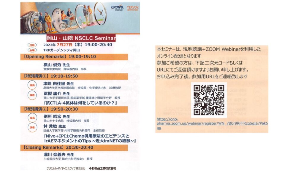 今日は、19:00からセミナーがあります。講演1は、岡山大学腫瘍微小環境学分野教授の富樫庸介先生が「抗CTLA-4抗体は何をしているのか?」を、講演2は、近畿大学腫瘍内科教授の林秀敏先生が「NIVO+IPI±Chemo併用療法のエビデンスとirAEマネジメントのTips」を話してくれます。とても面白いお話しが聴けると思います。