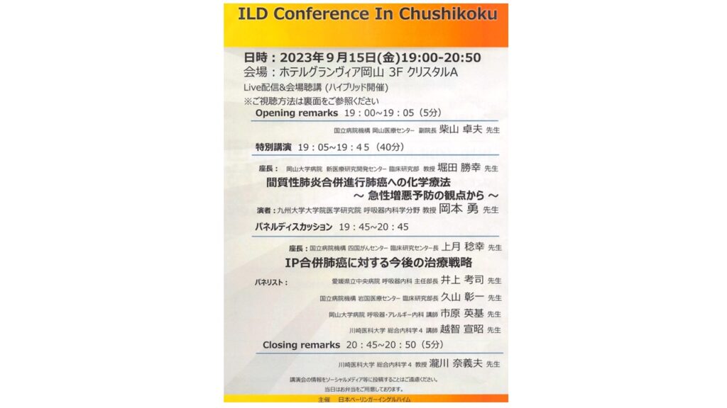 昨日は九州大学呼吸器内科の岡本勇先生が、教授就任後はじめて岡山に来られました。J-SONIC試験のCBDCA+nabPTX±nintedanibを中心に講演してくれました。また、10年以上の経過が終えたIPFの前向き観察研究の詳細についてもわかりやすいお話しでした。肺癌患者の10-20%にはILDが合併しており、この分野も精力的に研究しなければなりません。後半のパネルディスカッションには、当科の越智先生をはじめ、岡山、愛媛、山口から間質性肺炎合併の進行肺癌治療の症例が提示され、治療方針を話し合いました。どこの施設でも同じようなことを悩んでいることがよくわかりました。とても有意義な会であり、ベーリンガーインゲルハイムの方々に感謝いたします。