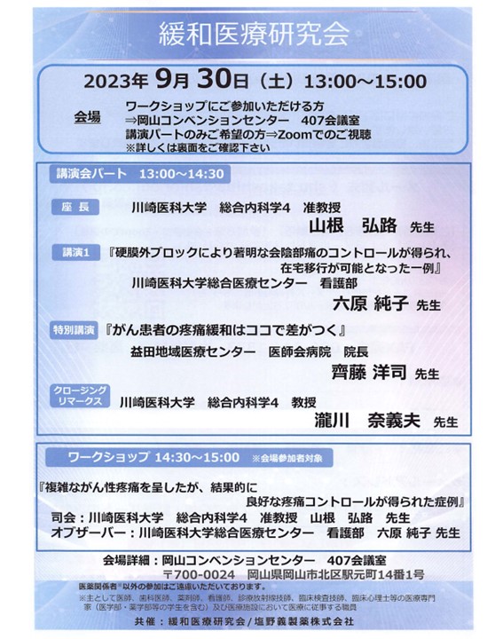 緩和医療研究会の講演会 2023 9/29 講演会・学会発表 2023年9月29日 2023年9月29日 明日9/30(13:00-)、緩和医療研究会の講演会を岡山コンベンションセンターで開催します。島根大学麻酔科学教室前教授の斎藤洋司先生にお越しいただきます。WEBでも聴講できますが、会場で皆様とお会いできることを楽しみにしています。 講演会・学会発表 よかったらシェアしてね! URLをコピーしました! URLをコピーしました! KRAS G12C ILAとICI この記事を書いた人 ntakigaw 関連記事 NTMの会 2026年2月9日 岡山市医師会シンポジウム 2026年1月29日 呼吸器関連地方会(米子) 2025年12月17日 がん治療と仕事の両立支援 2025年12月15日 老年腫瘍学ワークショップ 2025年12月4日 内科地方会演題 2025年11月20日 第133回日本内科学会中国地方会 2025年11月19日 がん免疫薬物療法マネジメントセミナー(アドバンスコース) 2025年11月15日 コメント コメントする コメントをキャンセルコメント ※ 名前 ※ メール ※ サイト 次回のコメントで使用するためブラウザーに自分の名前、メールアドレス、サイトを保存する。