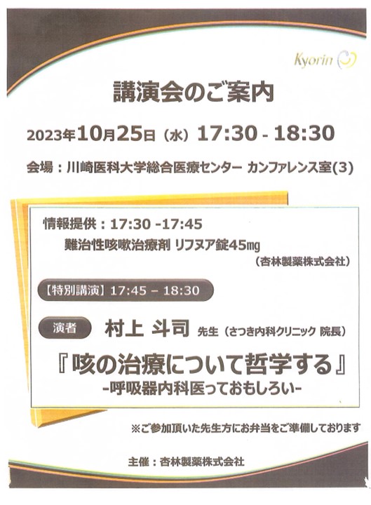 昨日はさつき内科クリニックの村上斗司院長が、当院で講演をしてくれました。岡山大学、尾道、姫路で、とてもactiveに仕事をされ、5年前に夢であった開業をされとても盛況です。今回は咳の治療と、呼吸器内科医としての哲学も話してくれました。とても興味深い内容でした。もともと教育にも造詣が深く、また当院で若い先生の指導もお願いしたいです。