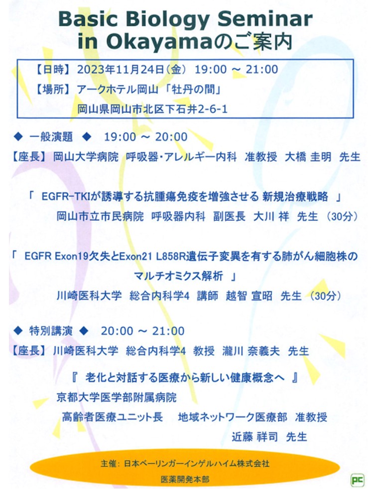 毎年ベーリンガーインゲルハイムが主催してくれる基礎研究のセミナー開催日となりました。岡山大学呼吸器・アレルギー内科との交流もはかっています。当科からは越智先生が発表します。特別講演として、京都大学医学部附属病院の近藤祥司先生が「老化と対話する医療から新しい健康概念」をこれまで行ってきた基礎研究から臨床へ繋がる話をしてくれます。