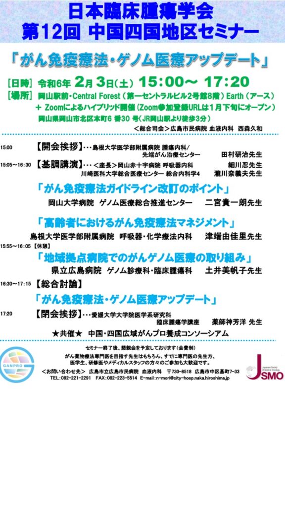 明後日(2/3土曜15:00-)、「日本臨床腫瘍学会 中国四国地区セミナー」が開催されます。JSMOのがん薬物療法の専門医、専門医を目指している専攻医の先生方はもちろん、初期研修医、医学生、メディカルスタッフの方々ご参加ください。中四のエキスパートの先生方が講演します。現地でもZOOMでもどうぞ。
