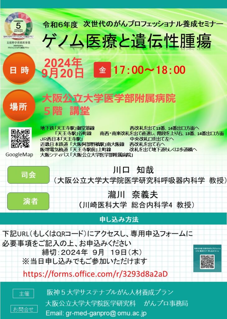 先週末9/20は、大阪公立大学呼吸器・腫瘍内科学講座の川口知哉先生に呼ばれ、次世代のがんプロフェッショナル陽性セミナーで講演をしてきました。大阪公立大学は初めてでしたが、大都会のホテルのような佇まいで大学も病院もありました。他分野の先生も来られて、私が遺伝性腫瘍についても話をするのがおこがましい感じでした。今年から呼吸器外科の教授になられた宗先生も来てくださり、岡山大学時代の懐かしい話しもでき楽しかったです。