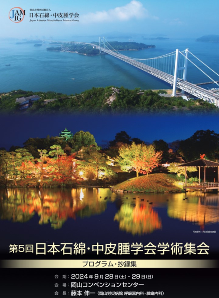 先週末の9/28-29に第5回日本石綿・中皮腫学会学術集会が、岡山コンベンションセンターで開催されました。学会長は岡山労災病院の藤本伸一先生で、私は基礎研究の座長、山根先生は緩和の座長をつとめさせていただきました。内科、外科、基礎研究者、そして患者会の皆さんが参加される賑やかな学会でした。中皮腫は希少疾患ですが、様々な立場の人の熱い討論を聴けました。藤本先生、ありがとうございました。