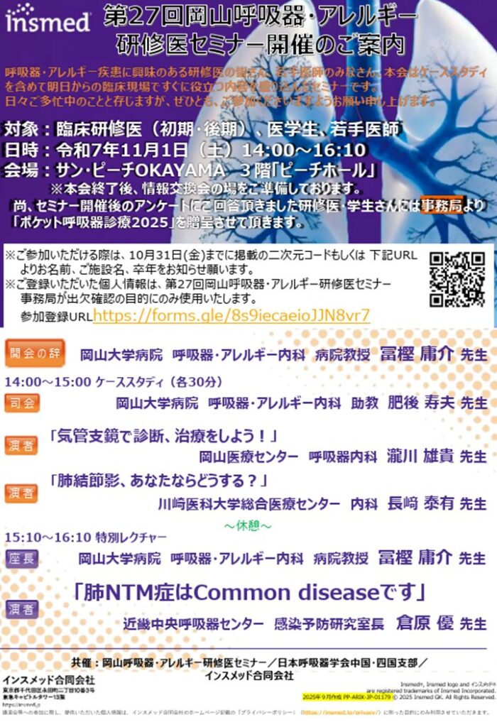 11/1(土曜)14:00-には、第27回岡山呼吸器・アレルギー研修医セミナーもあります。ケーススタディでは当科の長﨑先生も症例提示をします。特別講演は近畿中央呼吸器センター の倉原優先生です。とてもわかりやすくお話ししてくれる先生です。初期研修医・専攻医で、興味のある先生方はどうぞご参加ください。
