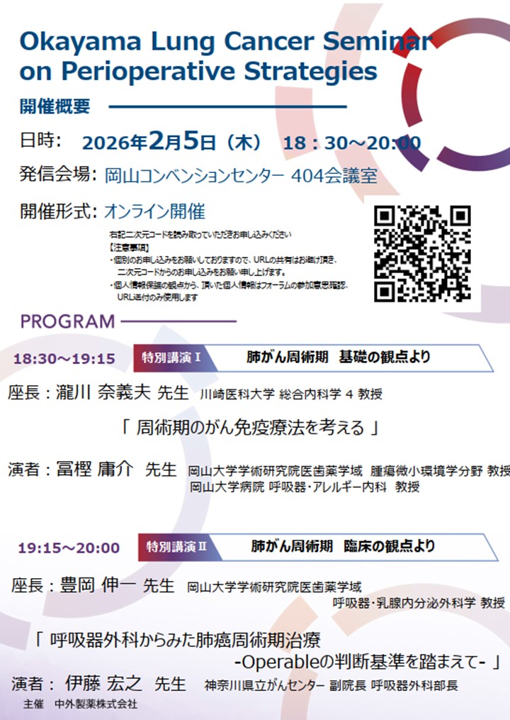 今週2/5(木)にOkayama Lung Cancer Seminar on Perioperative StrategiesがWEB開催されます。肺がん周術期を基礎の観点より岡山大学の冨樫庸介先生が、臨床の観点より神奈川県立がんセンターの伊藤宏之先生が講演してくれます。がん免疫療法の有効性を基礎と臨床の立場から論じてくれると思います。